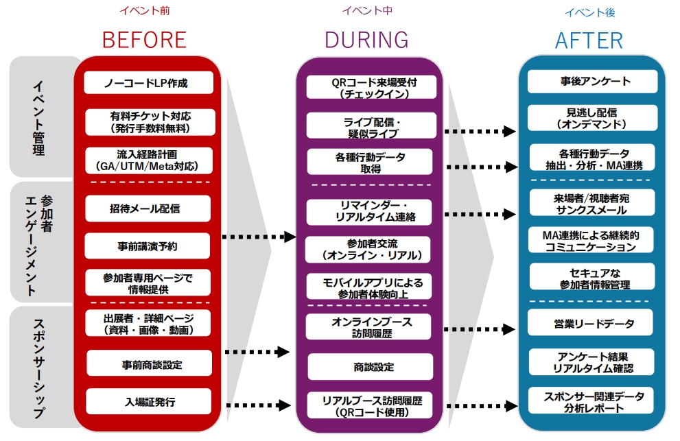 資料をダウンロードする企画・集客などイベント準備のから開催当日、フォローアップ、分析までトータルでサポートします。